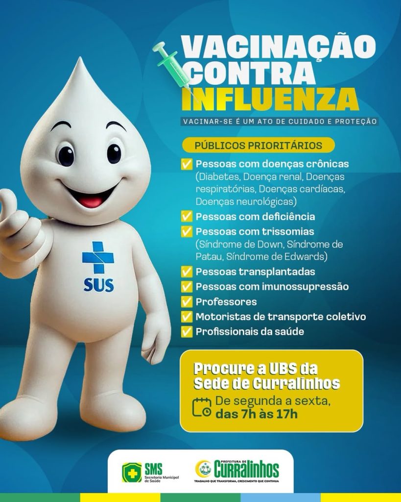A Prefeitura Municipal de Curralinhos, por intermédio da Secretaria Municipal de Saúde, informa à população que a campanha de vacinação contra a Influenza continua no município. Os cidadãos que integram os grupos prioritários definidos pelo Programa Nacional de Imunizações devem procurar a Unidade Básica de Saúde (UBS) da Sede para receber a dose e garantir sua proteção contra o vírus da gripe e suas complicações.