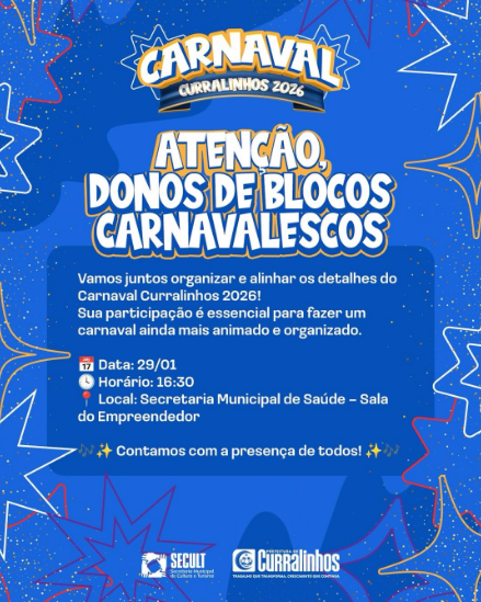 A Prefeitura Municipal de Curralinhos convida todos os representantes e donos de blocos carnavalescos do município para participarem de uma reunião de alinhamento e organização do Carnaval Curralinhos 2026.