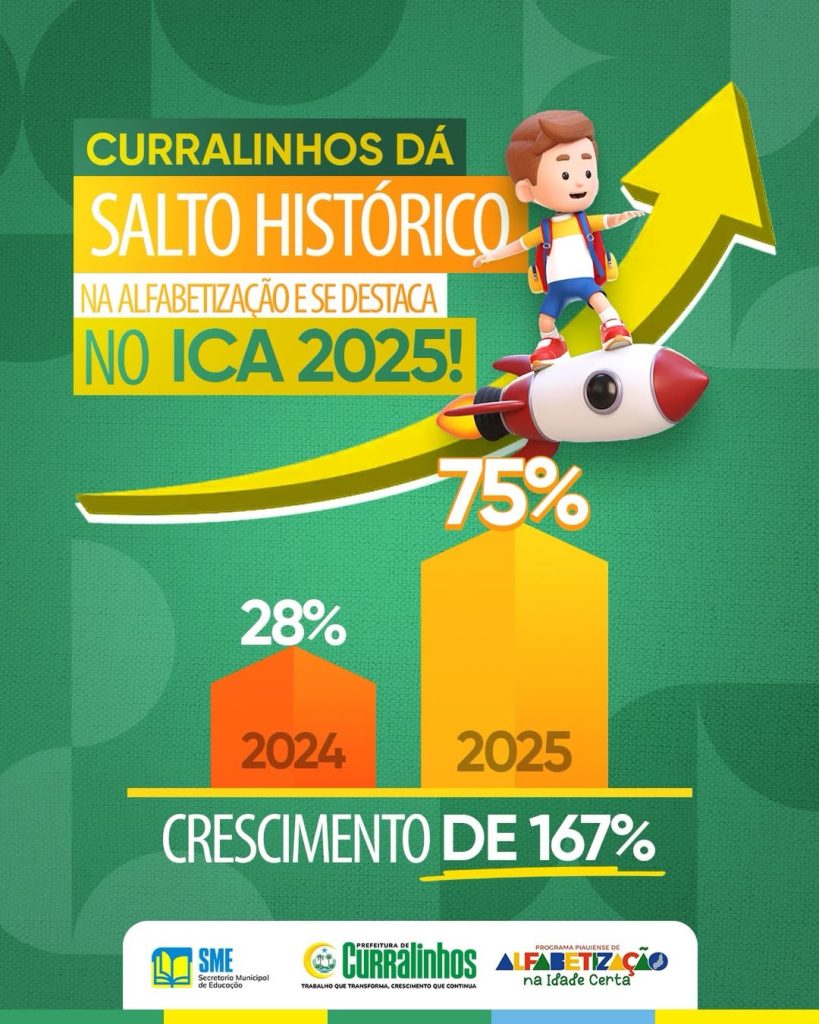 A Prefeitura Municipal de Curralinhos, por meio da Secretaria Municipal de Educação, comemora um importante avanço na área educacional. O município alcançou 75% no índice de alfabetização em 2025, consolidando-se como destaque no Programa Piauiense de Alfabetização na Idade Certa.