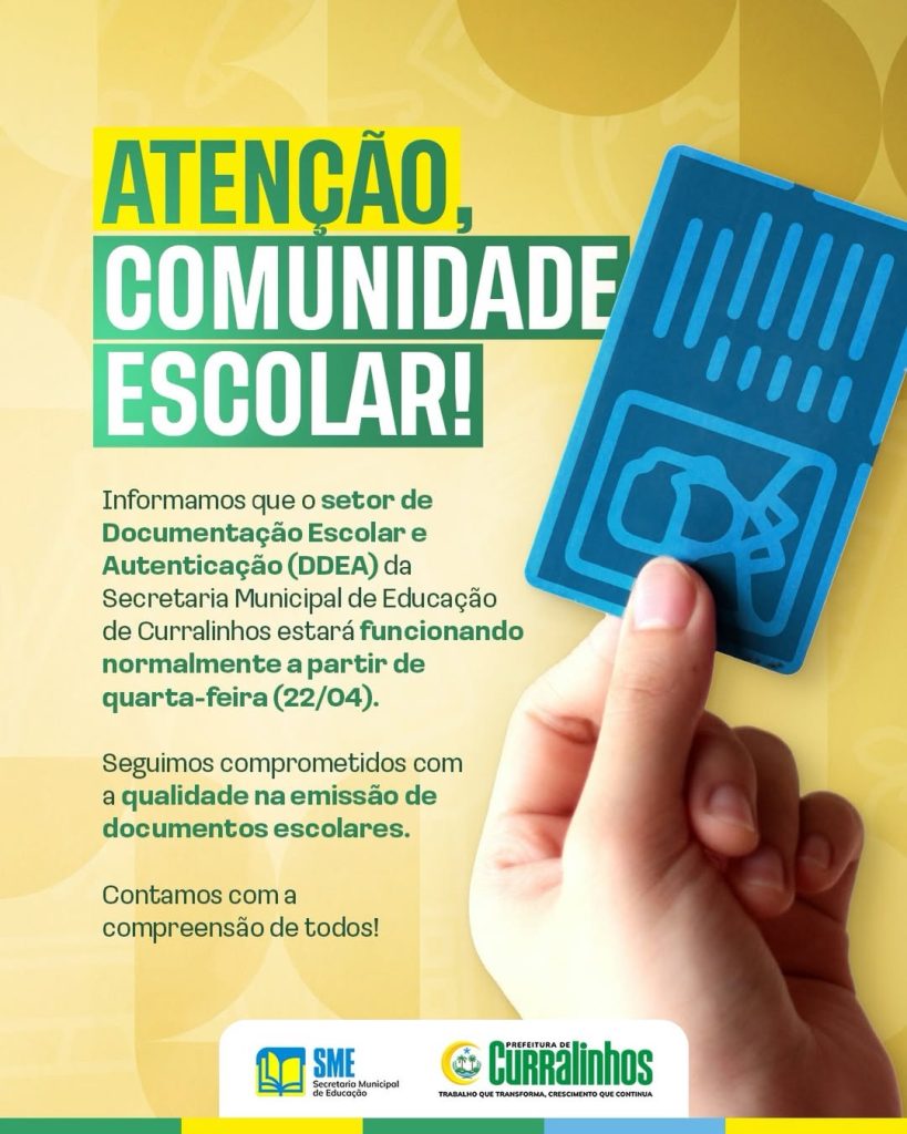 A Prefeitura Municipal de Curralinhos, por meio da Secretaria Municipal de Educação, informa à comunidade escolar que o setor de Documentação Escolar e Autenticação (DDEA) retomará seu funcionamento normal a partir da próxima quarta-feira, dia 22 de abril.