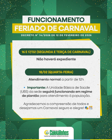 A Prefeitura Municipal de Curralinhos informa à população, por meio do Decreto nº 14/2026, de 12 de fevereiro de 2026, o funcionamento dos órgãos públicos municipais durante o feriado de Carnaval.
