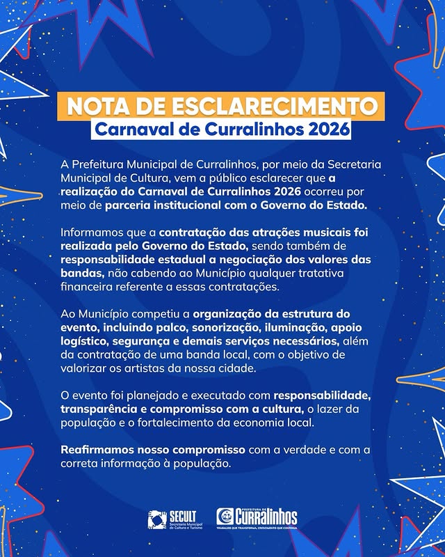 A Prefeitura Municipal de Curralinhos, por meio da Secretaria Municipal de Cultura, vem a público prestar esclarecimentos acerca da organização e realização do Carnaval de Curralinhos 2026, reafirmando seu compromisso com a transparência e o respeito à população.