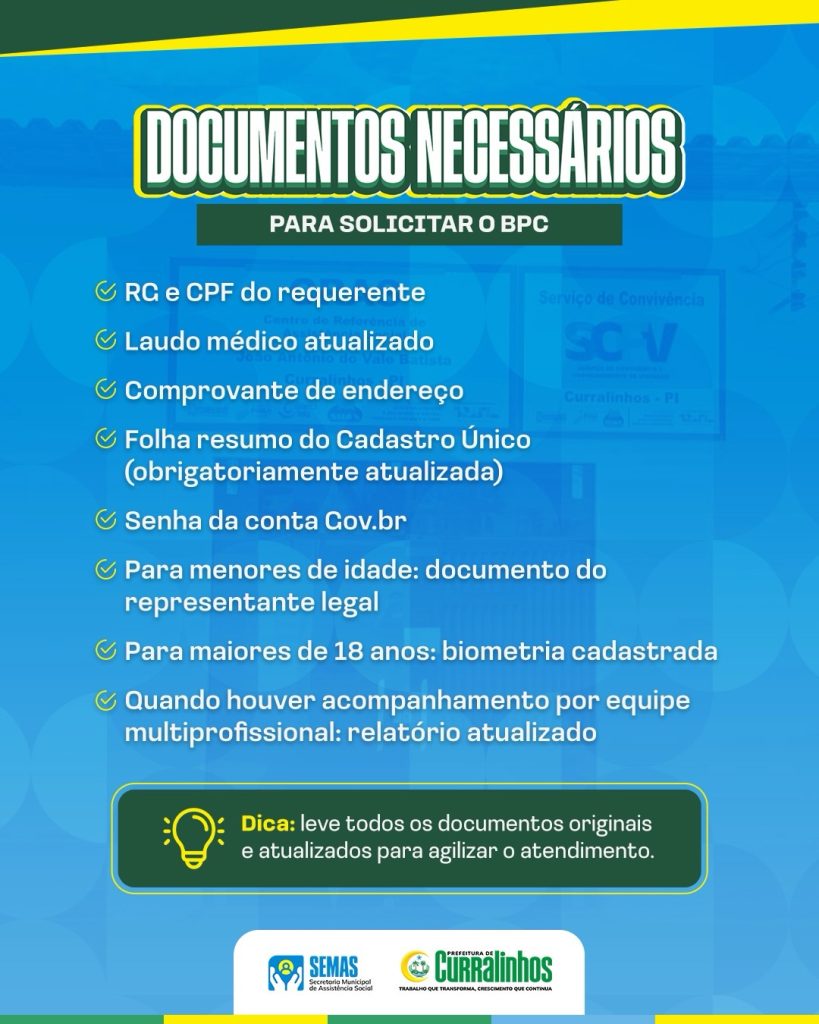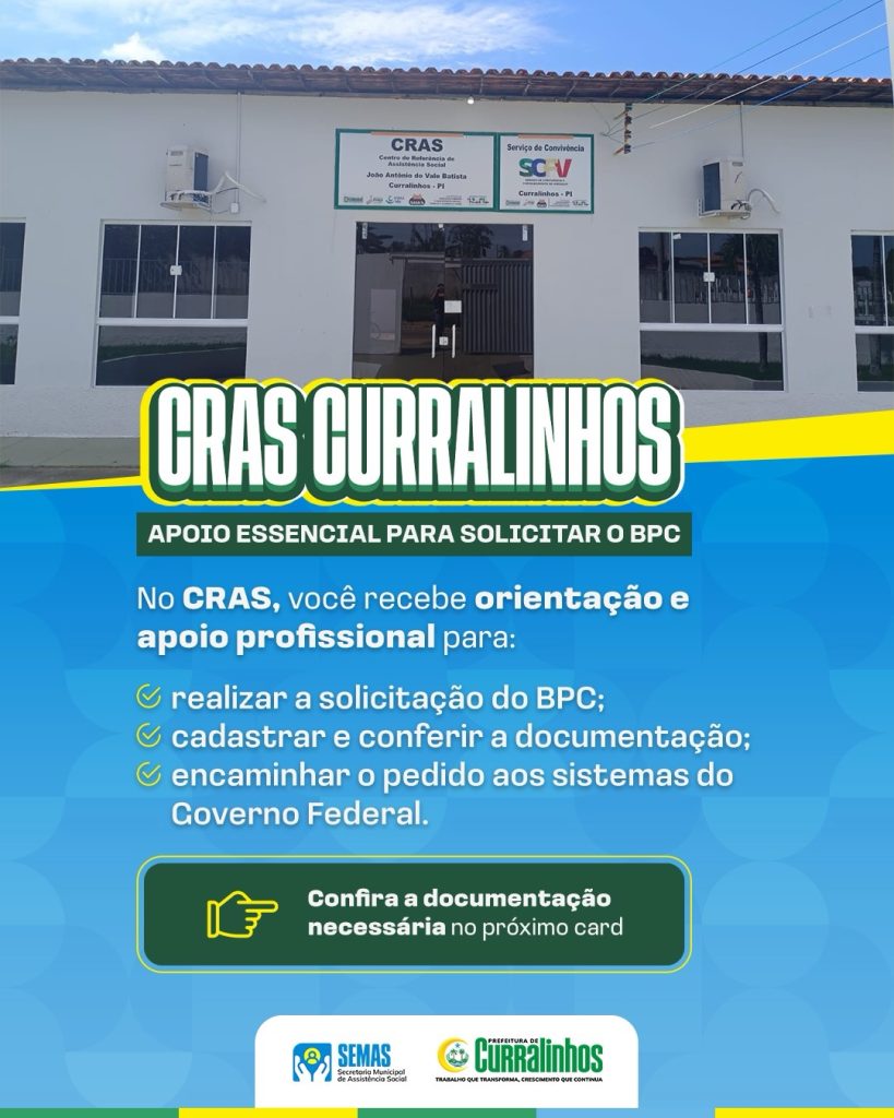 A Prefeitura Municipal de Curralinhos informa que o CRAS Curralinhos está à disposição da população para oferecer orientação e apoio completo no processo de solicitação do Benefício de Prestação Continuada (BPC).