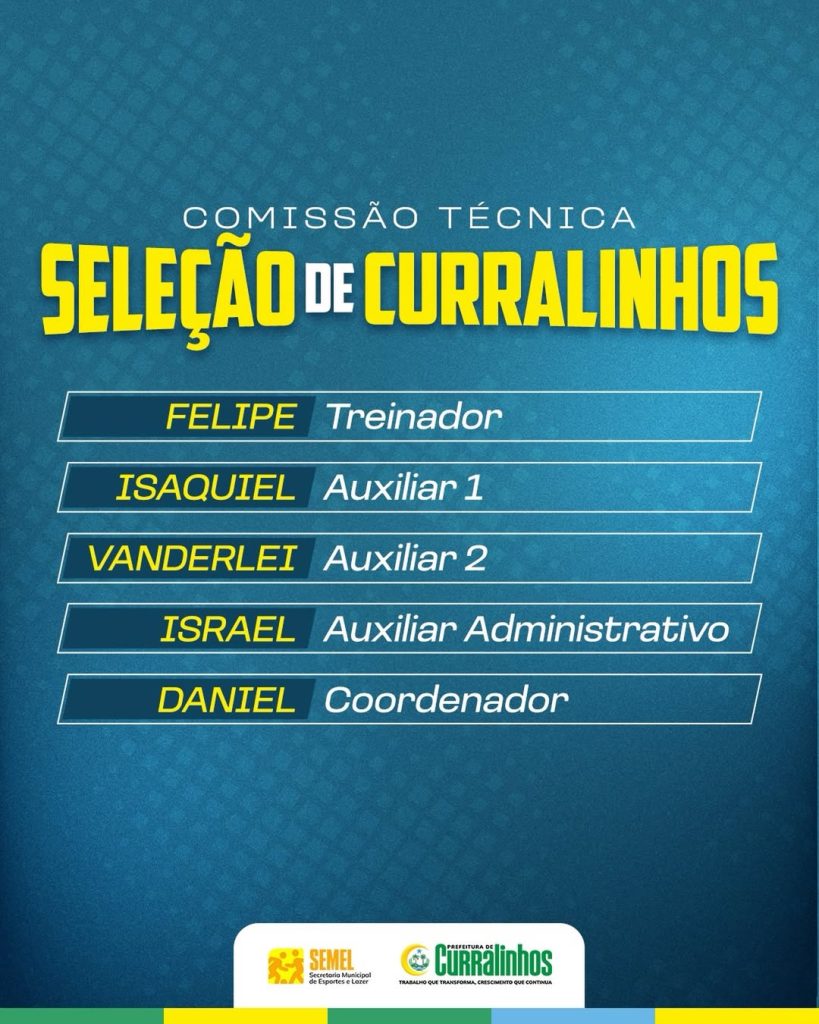 A Prefeitura de Curralinhos divulga a comissão técnica da Seleção Municipal 2026, composta por profissionais dedicados, organizados e comprometidos com a preparação e o desempenho da equipe que representará o município nas competições esportivas.