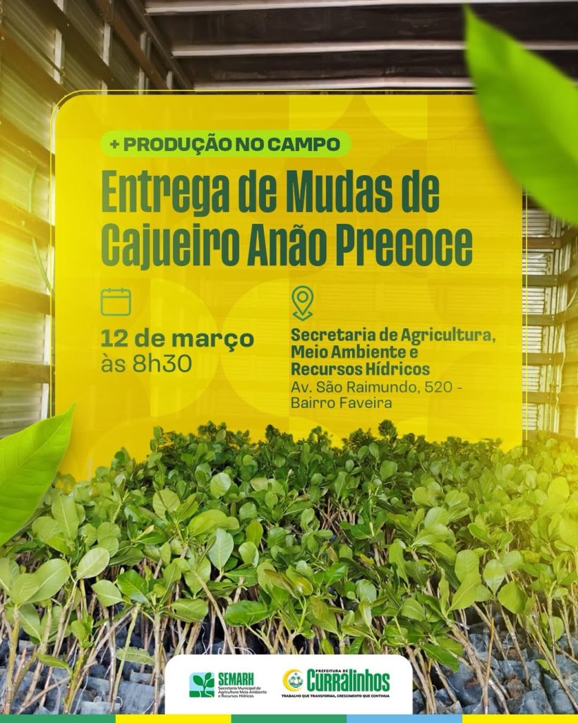 A Prefeitura Municipal de Curralinhos, por meio da Secretaria Municipal de Agricultura, Meio Ambiente e Recursos Hídricos, convida os agricultores familiares do município para participarem da entrega de mudas de cajueiro anão precoce, ação que integra as iniciativas de incentivo e fortalecimento da produção agrícola local.