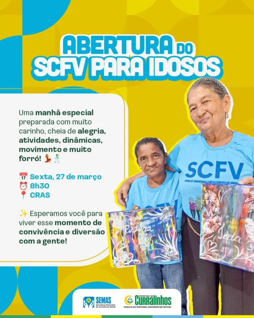 A Prefeitura Municipal de Curralinhos, por meio da Secretaria Municipal de Assistência Social, convida todos os idosos atendidos pelo Serviço de Convivência e Fortalecimento de Vínculos (SCFV) para participarem da abertura oficial das atividades do serviço.