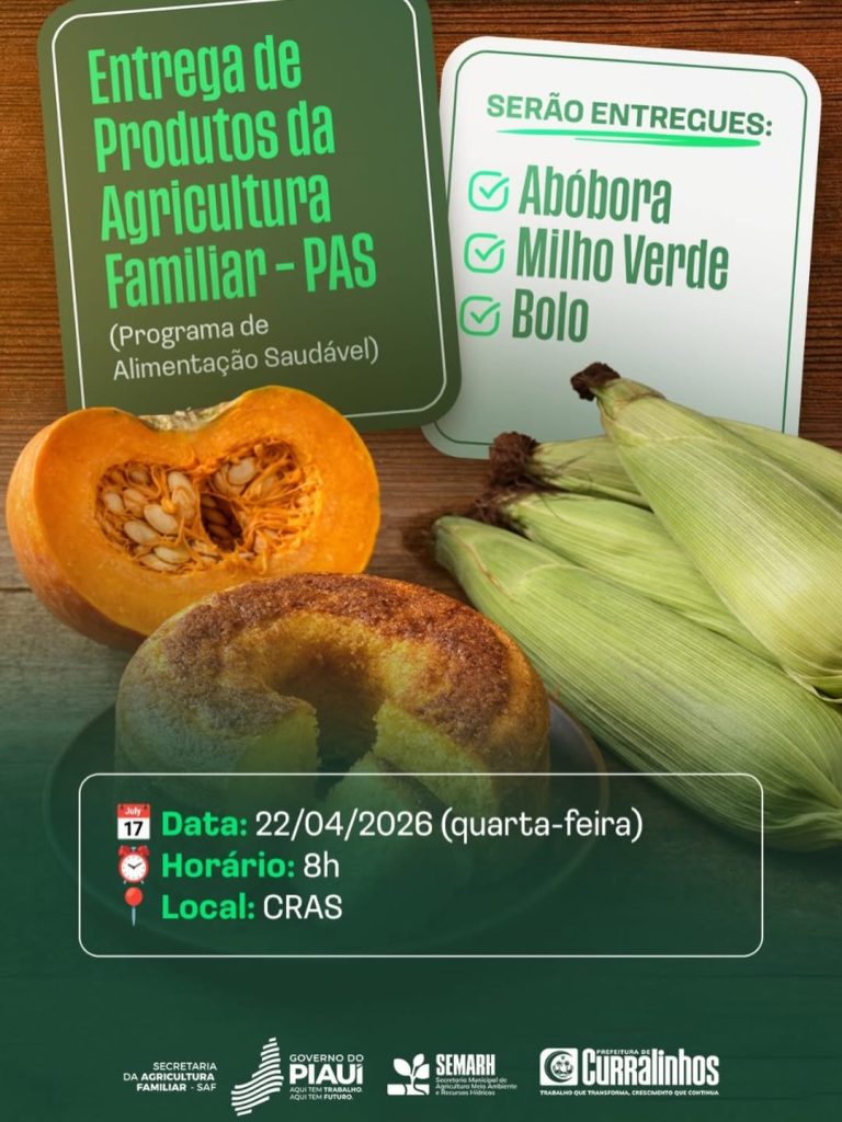 A Prefeitura Municipal de Curralinhos informa à população que, nesta quarta-feira, dia 22 de abril, será realizada a entrega dos produtos provenientes da Agricultura Familiar por meio do Programa de Alimentação Saudável (PAS). A ação tem como objetivo fortalecer a segurança alimentar e nutricional das famílias do município, ao mesmo tempo em que valoriza o trabalho dos agricultores familiares locais.