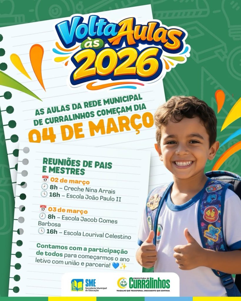 A Prefeitura Municipal de Curralinhos informa que as aulas da Rede Municipal de Ensino terão início no dia 04 de março, marcando o começo do ano letivo de 2026. A gestão reforça o compromisso com uma educação organizada, participativa e voltada ao desenvolvimento integral dos estudantes.