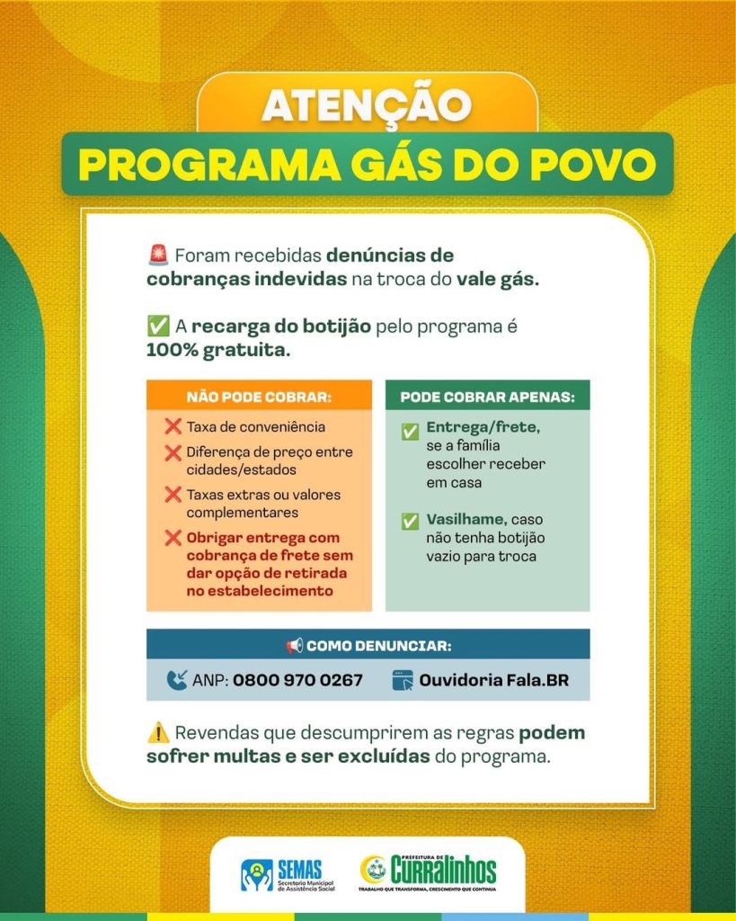 A Prefeitura Municipal de Curralinhos, por intermédio da Secretaria Municipal de Assistência Social (Semas), informa aos beneficiários do Programa Gás do Povo que a recarga do botijão é integralmente gratuita, não podendo ser cobrada qualquer taxa ou valor adicional por esse serviço. A administração municipal orienta a população a ficar atenta a práticas abusivas por parte de revendedores credenciados.